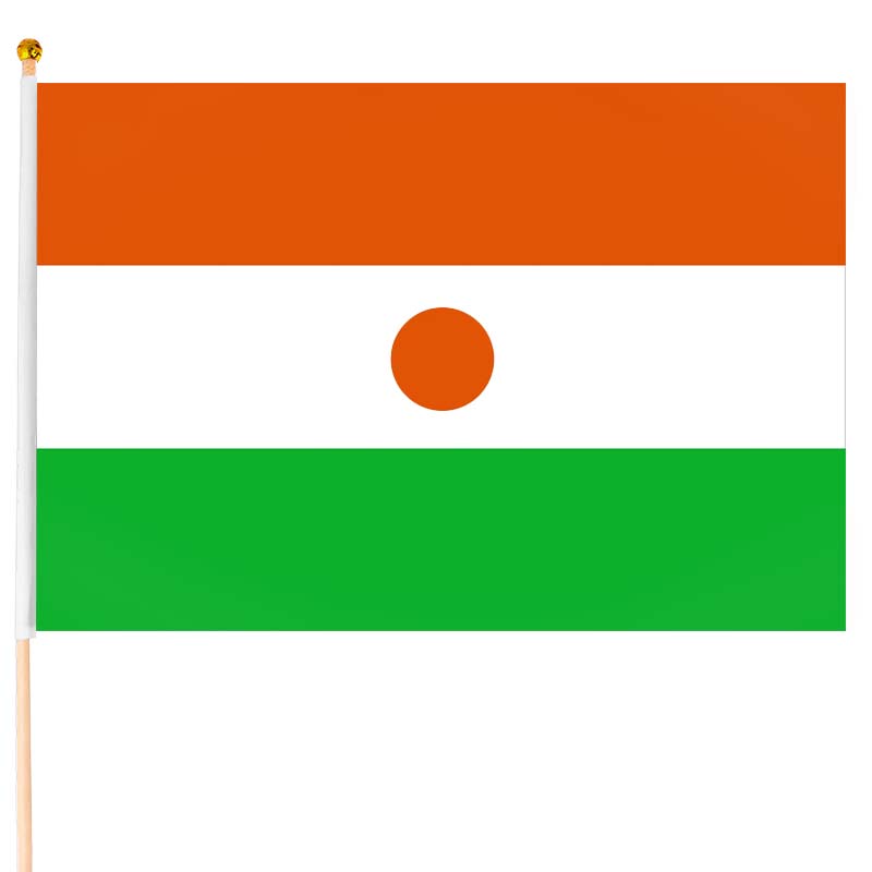 Vlajka je připevněna na držadle délky 61 cm, která je vyrobena ze dřeva. Na výrobu vlajky byl použit polyester. Vlajka je ideální jako dekorace do bytu, do podniku či jako symbol během fandění národnímu týmu. Každá barva vlajky Niger má konkrétní význam. Oranžový pruh je symbolem Nigerských pouští. Bílý pruh představuje řeku Niger a zelený pruh je symbolem naděje. Oranžový kruh ve středu vlajky symbolizuje slunce.